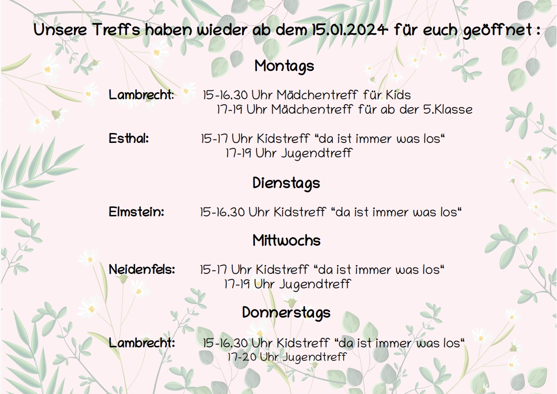 Dienstag, 14.06., 15 Uhr, Esthal: Kinder- und Jugendtreff offen (Flyer siehe unter Esthal)